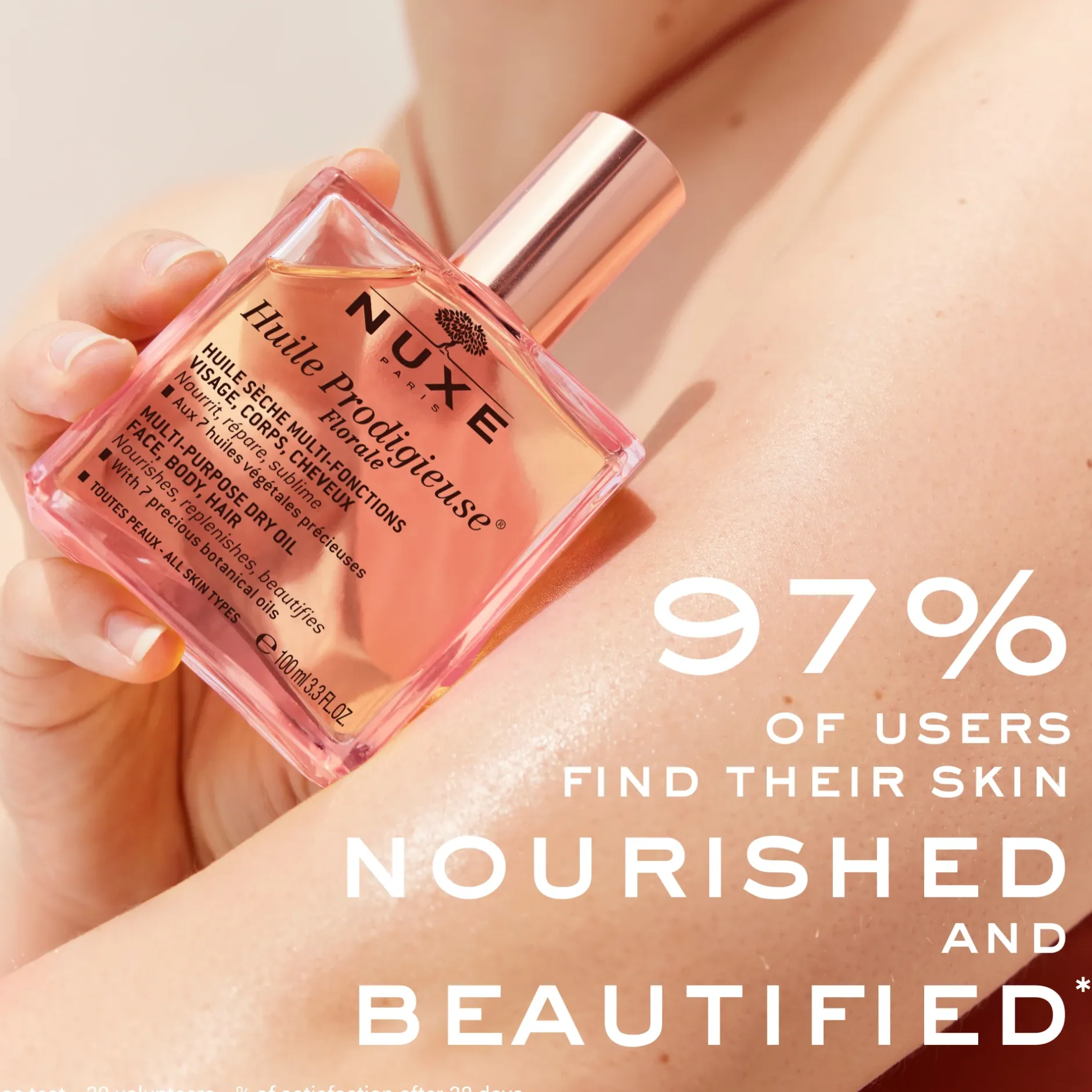 Lasciati sedurre dal mitico cocktail di 7 oli preziosi 100% vegetali dell’Huile Prodigieuse® Florale. In un solo gesto nutri, ripari ed esalti viso, corpo e capelli. L’Huile Prodigieuse® Florale lascia su tutti i tipi di pelle e un irresistibile luminosità satinata.Ha un’azione protettiva anti-inquinamento, attenua l’aspetto delle smagliature, apporta un’idratazione lunga durata e rafforza la funzione barriera della pelle. I capelli sono nutriti, riparati e morbidi. La sua efficacia è dimostrata: la pelle è più morbida per il 100%⁽¹⁾ delle donne, nutrita e riparata per il 97%⁽¹⁾& di loro.Il profumo dalle note floreali e gioiose di quest’olio secco inimitabile delizierà i sensi con onde scintillanti e luminose. Per creare l’Huile Prodigieuse®, NUXE ha selezionato 7 oli preziosi 100% vegetali: Tsubaki, Argan, Macadamia, Borragine, Camelia, Nocciola, Mandorla dolce. Un flacone di Huile Prodigieuse® contiene il 25% di omega 3, 6 e 9