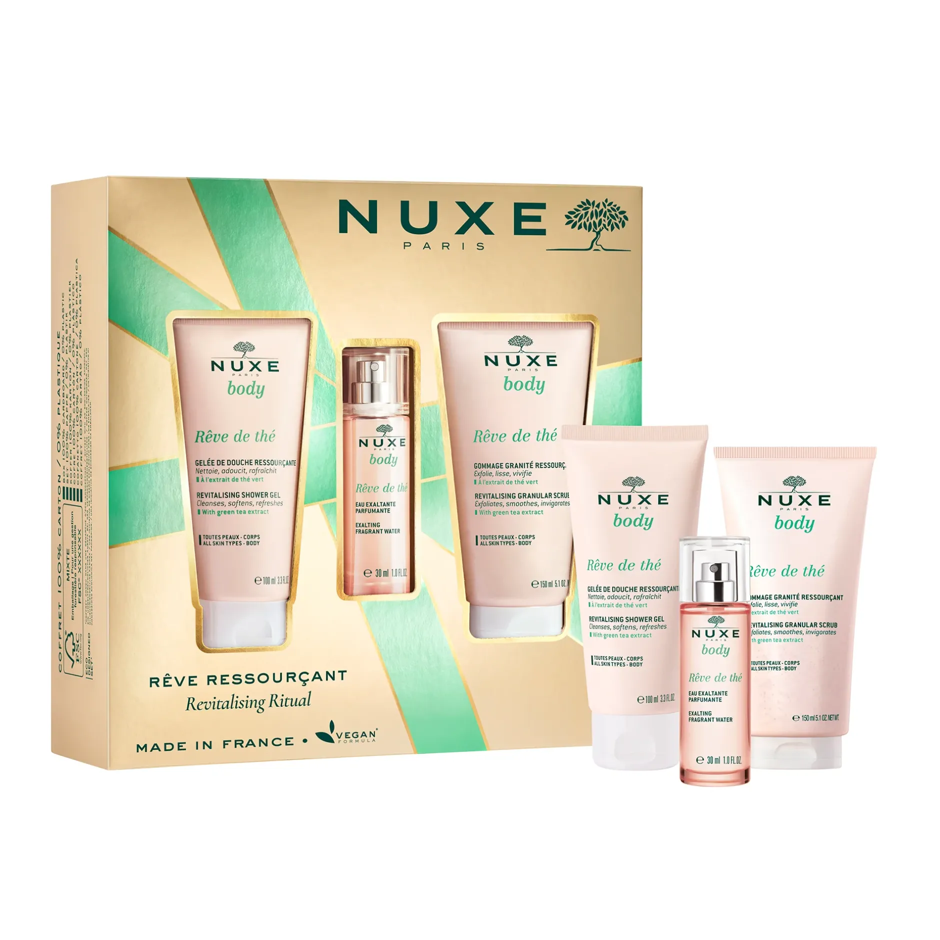 Concediti un autentico momento di benessere con questi tre trattamenti per il corpo rigeneranti ultra-freschi in una routine 100% feel-good*. Questo cofanetto trattamenti corpo contiene: – NUXE Body Rêve de Thé Acqua estasiante profumata 30 ml – NUXE Body Rêve de Thé Gel doccia rigenerante 100 ml – NUXE Body Rêve de Thé Esfoliante granulare rigenerante 150 ml *benessere Trattamenti formulati e prodotti in Francia. Cofanetto 100% cartone, 0% plastica e prodotto in Francia.Altezza: 230 mm Profondità: 69 mm Lunghezza: 230 mm Vivi un Natale magico con la playlist by Nuxe: https://open.spotify.com/playlist/2CNPL7lPKl9Jk24EjgVuMB?si=7752f1429f554f94